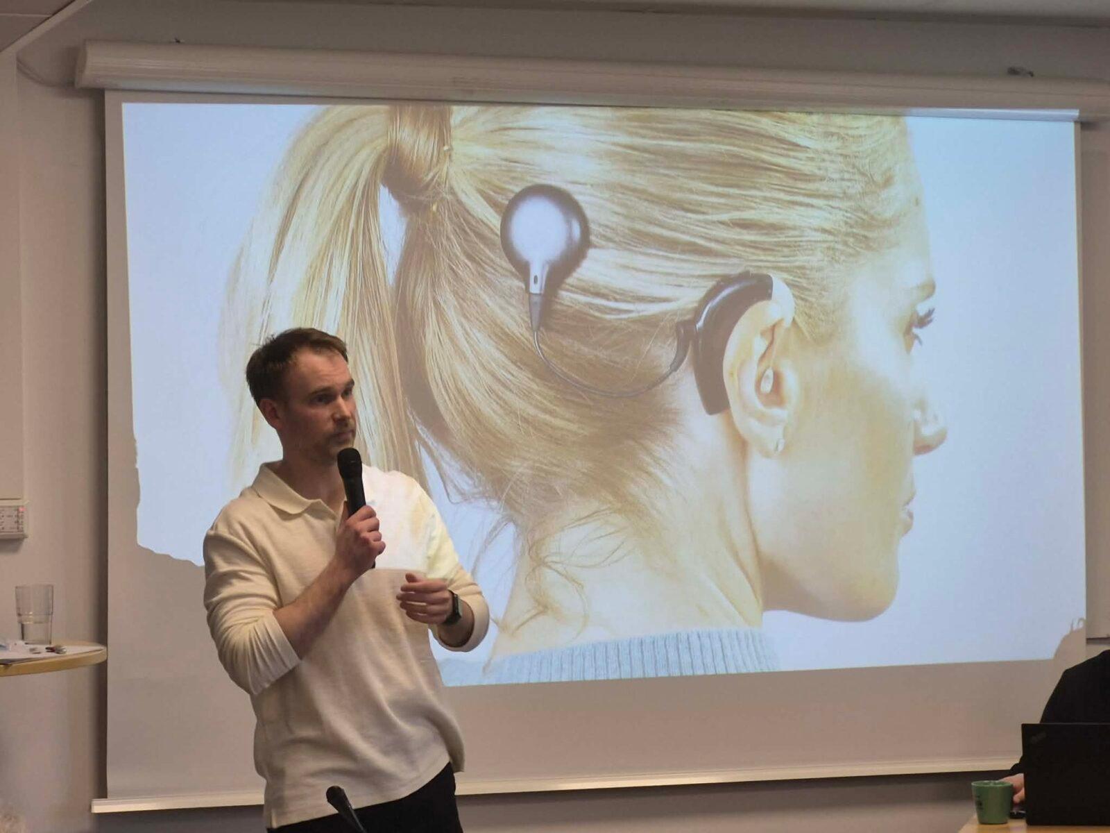 När det var dags för Användarträffen med Advanced Bionics kom Frederic Myr’en från kontoret i Solna. Vid sin sida hade han Dorte Clausen från kontoret i Danmark. Fredrik pratade på om AB’s processor och som han tyckte fördelarna med den. Han informerade om eller snarare siade om vad som tänkas kunna komma i framtiden. Han var förbjuden att vara för exakt. Vi blev informerade om en batterilucka som de dragit tillbaks. De önskade att vi alla kasserade luckan. De som ville kunde så klart få en ny.