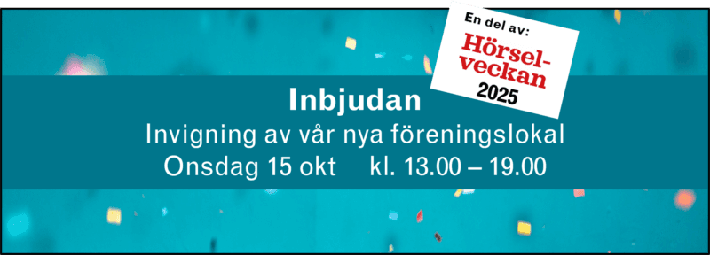 Alla är hjärtligt välkomna till invigningen av vår nya föreningslokal onsdagen den 15 oktober. Denna dag är Alla inbjudna, medlem eller icke medlem, hörselskadad eller anhörig, intresserad eller bara nyfiken Hoppas att vi ses på...