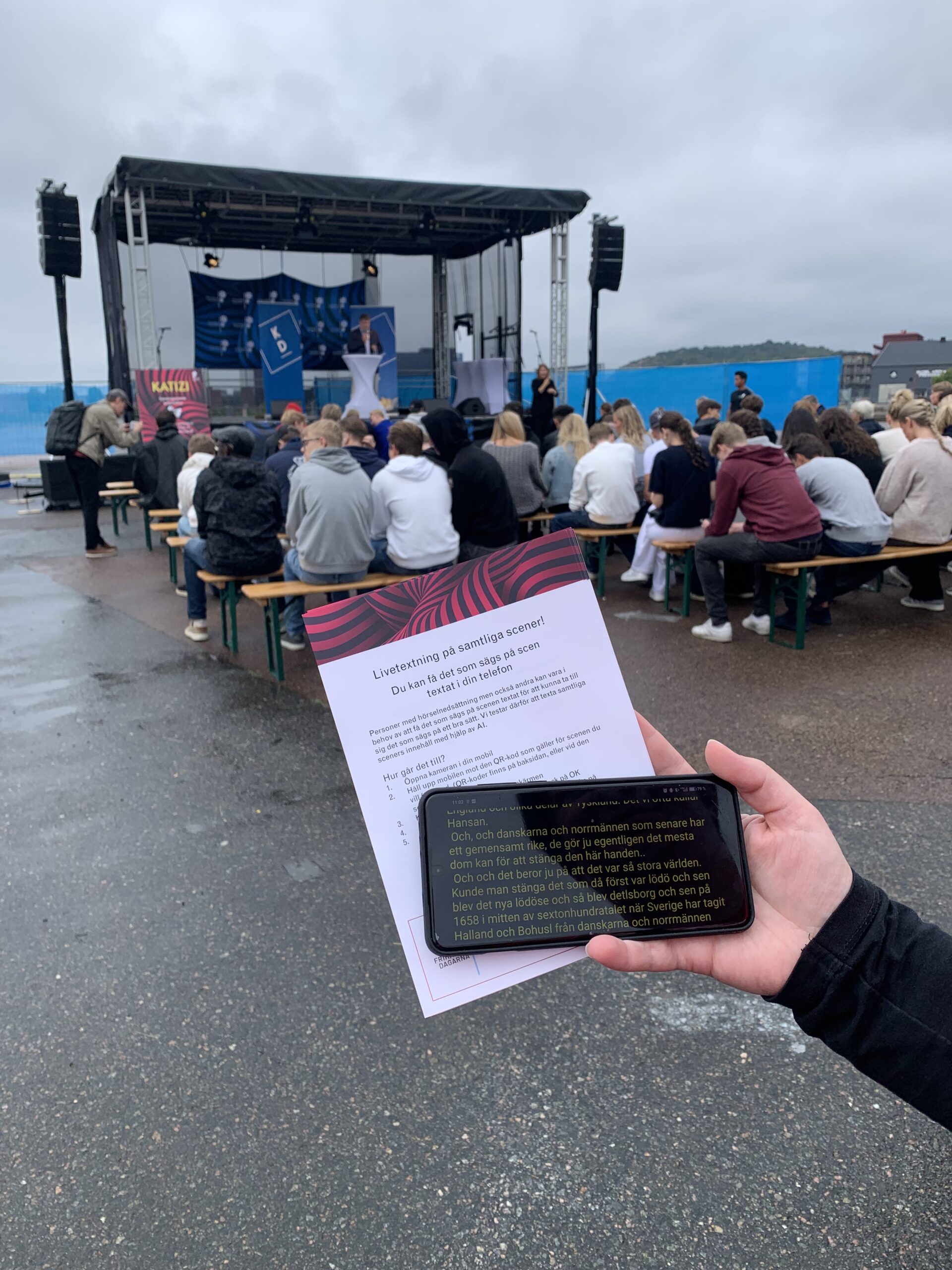 Flera av våra medlemmar var volontärer under de tre dagarna som evenemanget pågick och de gjorde att fantastiskt arbete med att sprida hörselkunskap, svara på frågor och visa hur textningen fungera. Det satt QR-koder vid respektive scens ingång och det var bara att scanna den med sin mobilkamera och så fick man textningen direkt i sin mobil. Alla vi prata med var imponerade av hur bra textningen fungera och hur snabb den var. Detta bådar gott för framtiden, att vi med hörselnedsättning kan delta på lika villkor.
