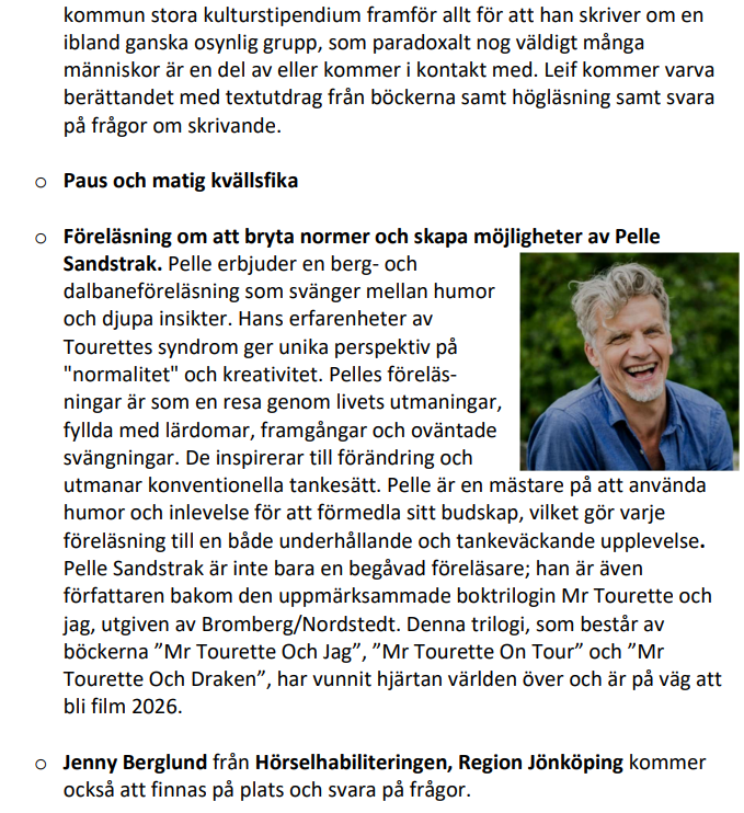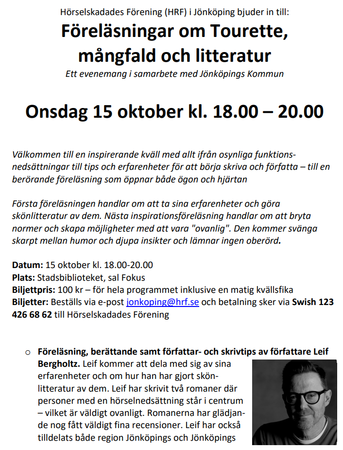 Välkommen till en inspirerande kväll med allt ifrån osynliga funktions-nedsättningar till tips och erfarenheter för att börja skriva och författa – till en berörande föreläsning som öppnar både ögon och hjärtan.