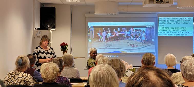 Mötet öppnades av ordförande Roland Elfving, som hälsade de 41 närvarande medlemmarna varmt välkomna och gav en extra hälsning till Gunita Persson och Andrej. De var inbjudna för att berätta om sitt engagemang för Ukraina, där Gunita sedan Rysslands invasion har organiserat omfattande insamlingar, från några kilo stearin till skyttegravsljus till cirka 200 ton material – allt tack vare generös hjälp från privatpersoner och företag.