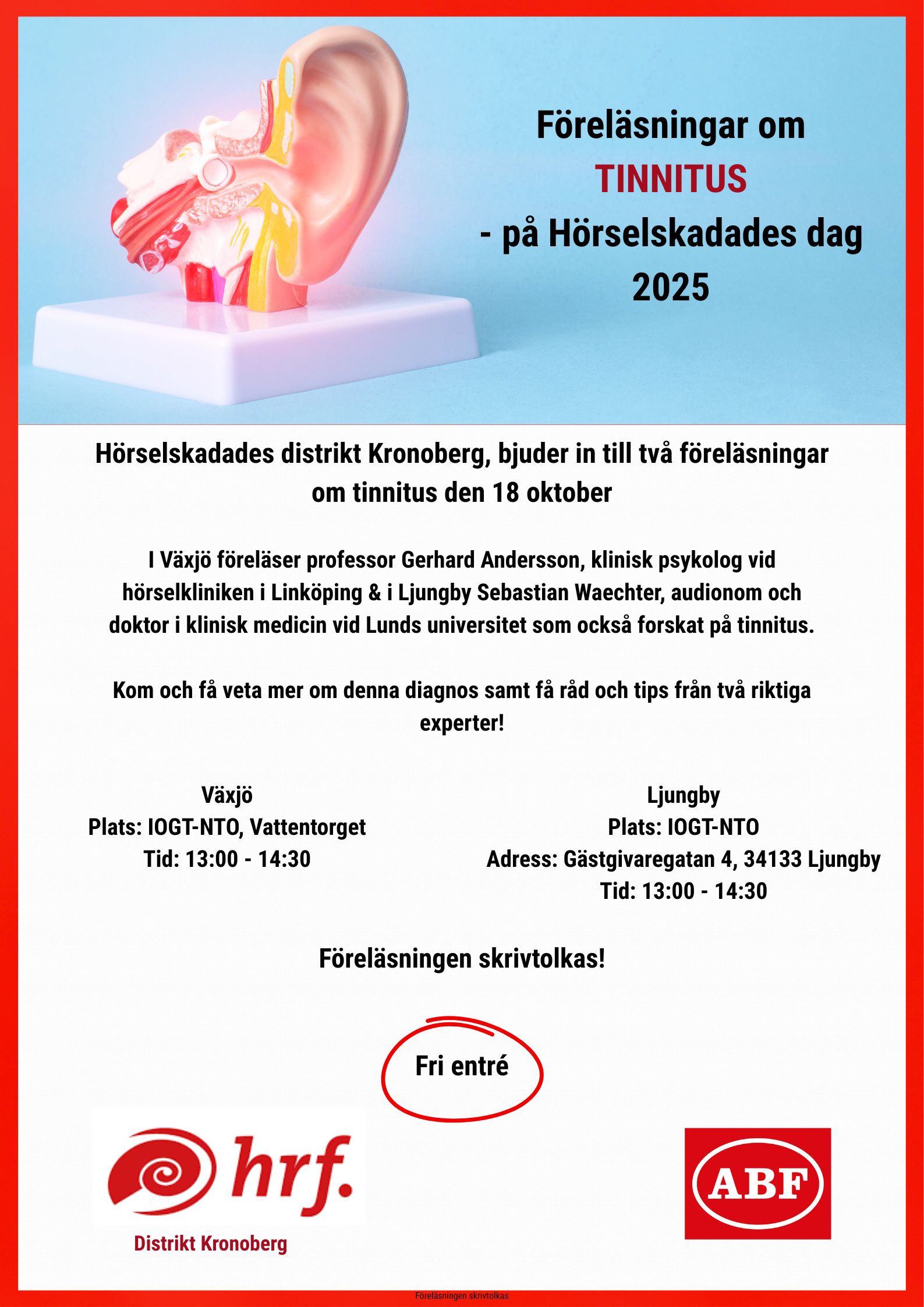 Den 18 oktober kl 13 håller vi en öppen föreläsning som HRF Kronoberg tillsammans med oss i HRF Ljungby arrangerar. Det är en aktivitet på Hörselskadades egen dag under årets hörselvecka.