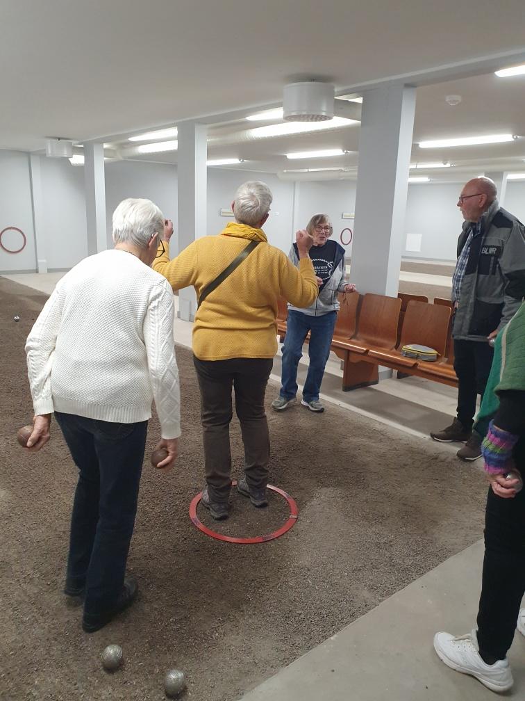 Efter utevistelsen förflyttade vi oss till Gullspångs arena. Det kändes bra att komma in i värmen och avnjuta kaffe och baguette. Där fanns extra möjlighet att ställa frågor till Jan om det vi sett under förmiddagen. Efter kafferasten blev det visning och information om arenan och om hur den blev till. Det var många ideella timmar som lagts ner på bygget. Vi fick höra hur arenan nu används med en mängd olika aktiviteter och vi fick prova på en av dem: boule. Under en av våra medlemmars ledning fick vi instruktioner och tips på, hur man bäst hanterar ett boule-klot.