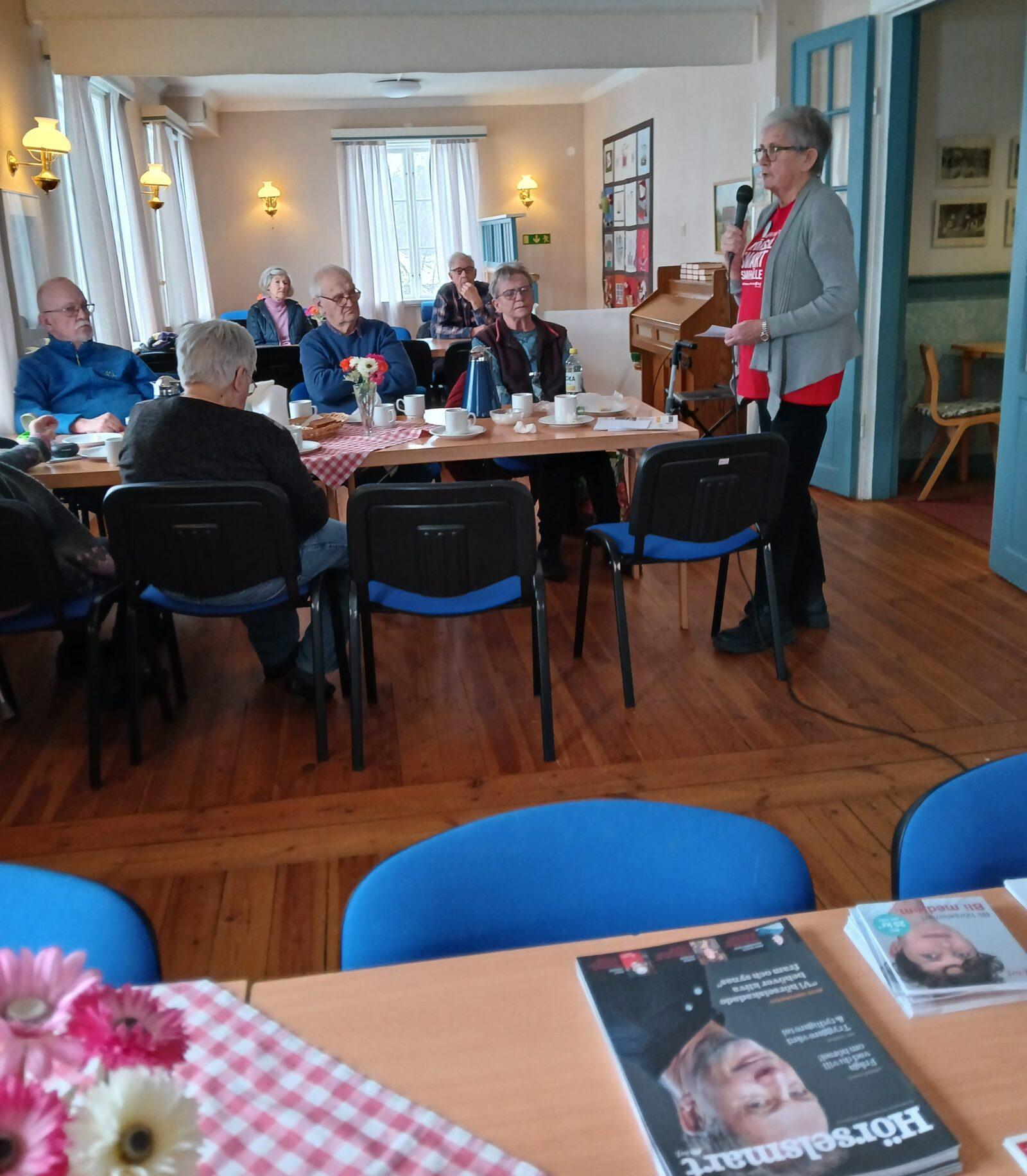 Ordförande Britt-Marie Åhman berättade även vad föreningen gör och bjöd bland annat in till de omtyckta samtalsträffarna ”Bli vän med dina hörapparater”. ”Blir det en intresserad grupp på minst 4 personer startar vi gärna upp en ny omgång här”, sa hon.