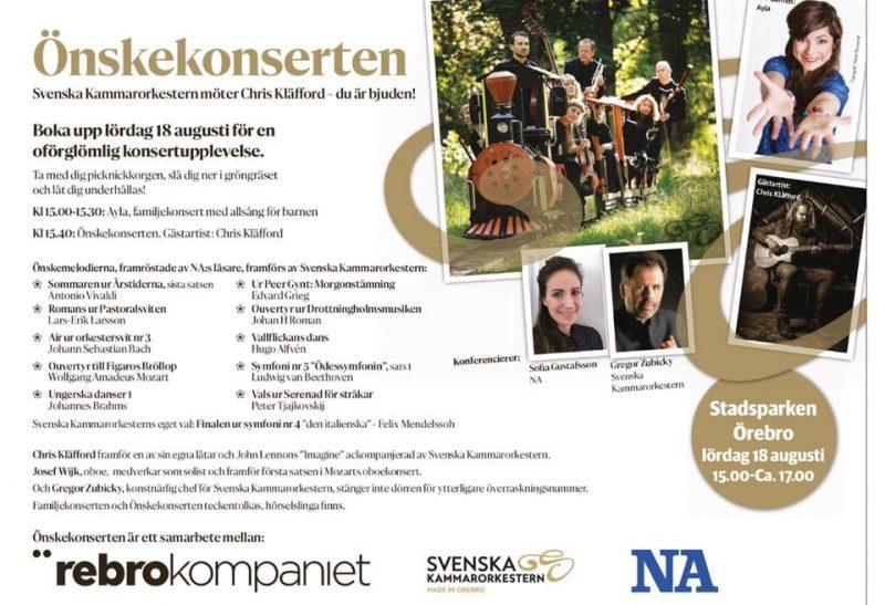 Svenska Kammarorkestern möter Chris Kläfford! Boka upp lördag 18 augusti för en oförglömlig konsertupplevelse. Ta med dig picknickkorgen, slå dig ner i gröngräset och låt dig underhållas. Kl 15.00-15.30: Ayla, familjekonsert med allsång för barnen. Kl 15.40: Önskekonserten med din önskemusik. Gästartist: Chris Kläfford Önskekonserten är teckentolkad. Fri entré.