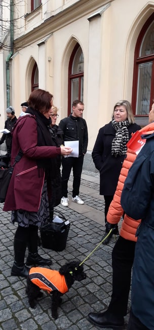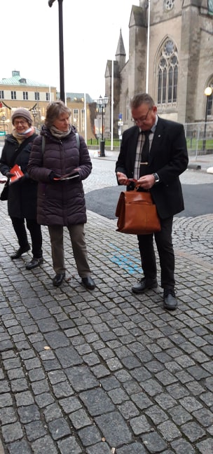 Vi delade ut flyers med viktig text och uppmaningå att regionfullmäktige inte skulle fatta beslut om abonnemangsavgifter för hörapparater. Vi fick också en dialog med några politiker.