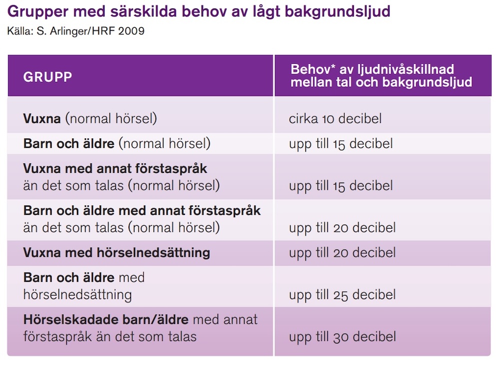 Tabellen visar behovet av skillnad i ljudnivå mellan det vi vill höra och bakgrundsljud för olika grupper. För vuxna med normal hörsel är behovet av ljudnivåskillnad cirka 10 decibel, medan för hörselskadade barn och äldre med ett annat förstaspråk än svenska behövs en skillnad på upp till 30 decibel.