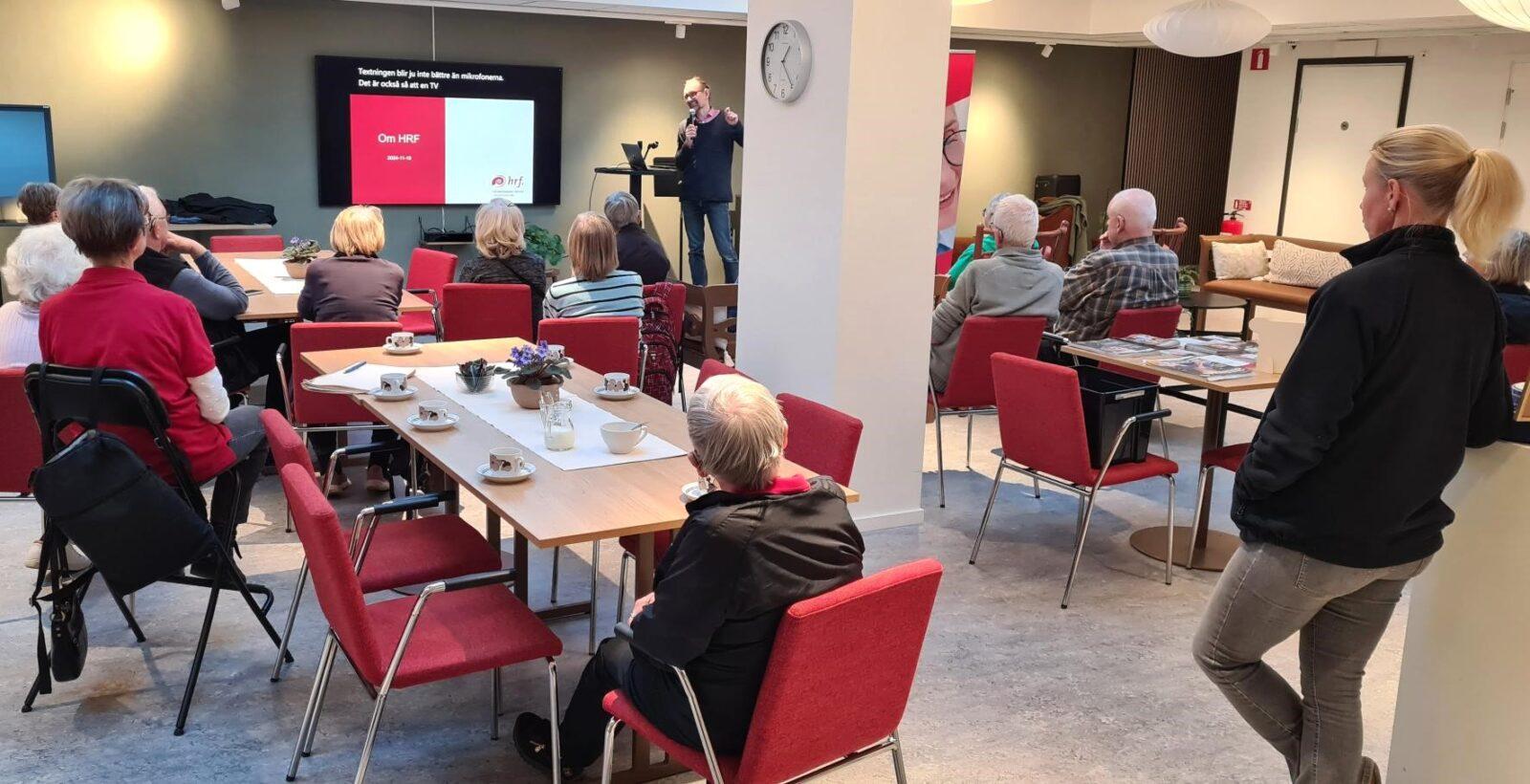 Oscar Hedenfeldt från HRF Stockholms län informerade om Hörselskadades Riksförbund och de frågor som organisationen arbetar med på olika nivåer, exempelvis om kommande förändringar inom hörselvården. Det blev många intressanta frågor.
