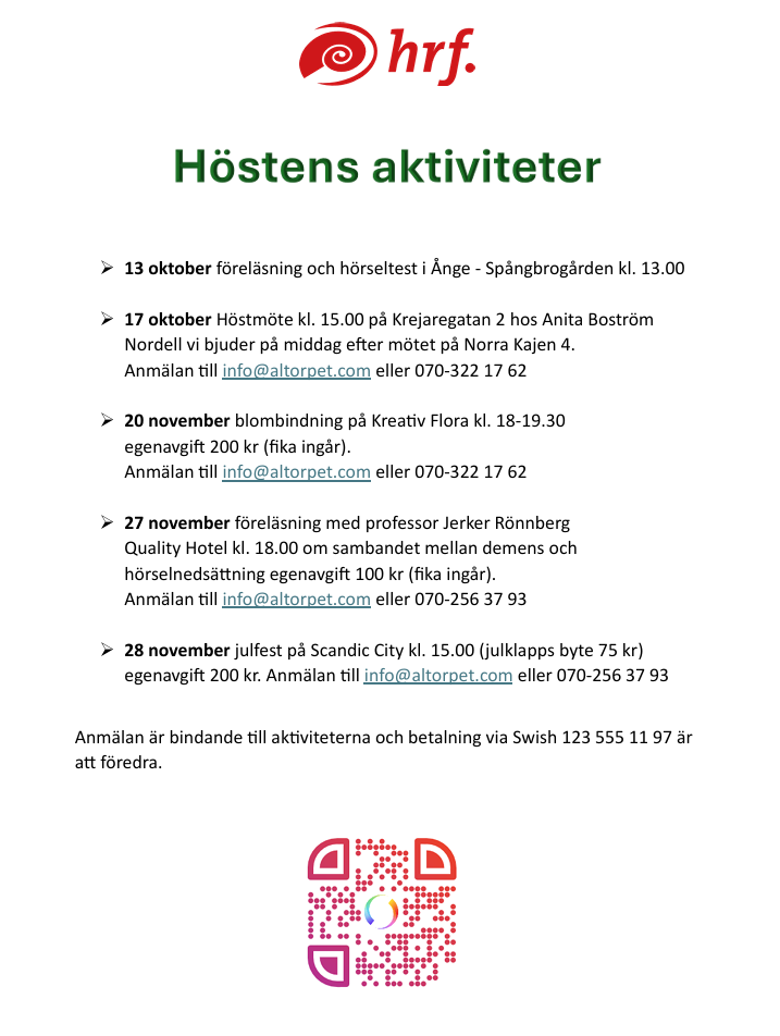 Föreläsning om Tinnitus i Alby 21 augusti Kramfors konferensen 23-24 augusti Bussresa till höga kusten 31 augusti Föreläsning med Jerker Rönnberg i september Salteriet i Junibosand i oktober TSS cirkel november-december Kurs blombindning i slutet av november Julfest i december