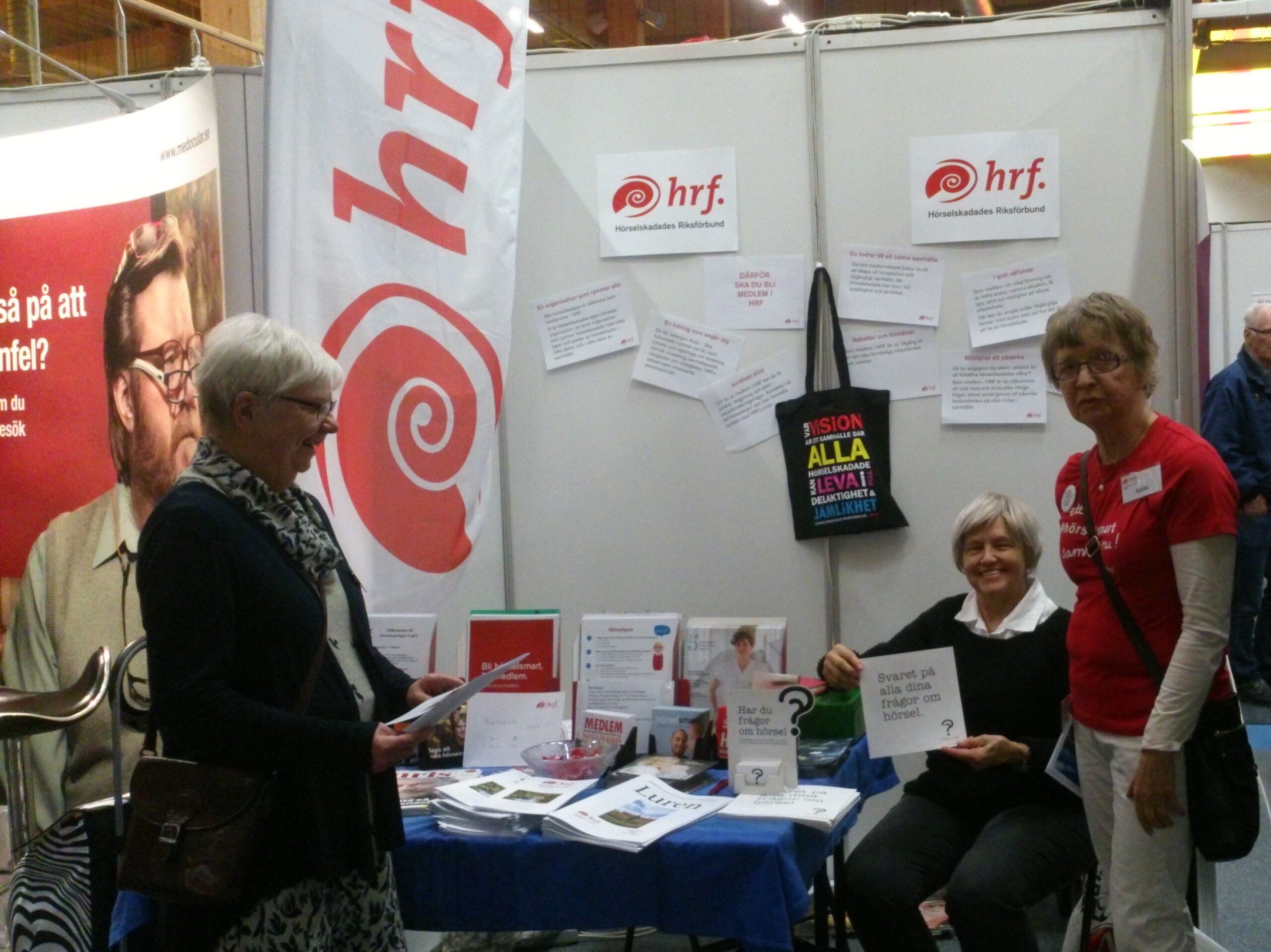 Den 23 och 24 mars bemannade HRF Uppsala ett informationsbord på årets 60-plusmässa. Syftet var att visa upp oss, få kontakt med besökare och förhoppningsvis även få några nya medlemmar. Vi hade massor av informationsmaterial, lite för mycket insåg vi när det nätt och jämnt fick plats på bordet. Det som verkade mest intressant var Tinnitus-området. Många kom förbi och pratade om sina problem och tog foldern om Tinnitus. Andra pratade lite allmänt om hörselnedsättning och hörapparater. Där mer detaljerad sakkunskap behövdes lotsade vi vidare till någon av de privata hörselföretagen som också fanns på plats.
