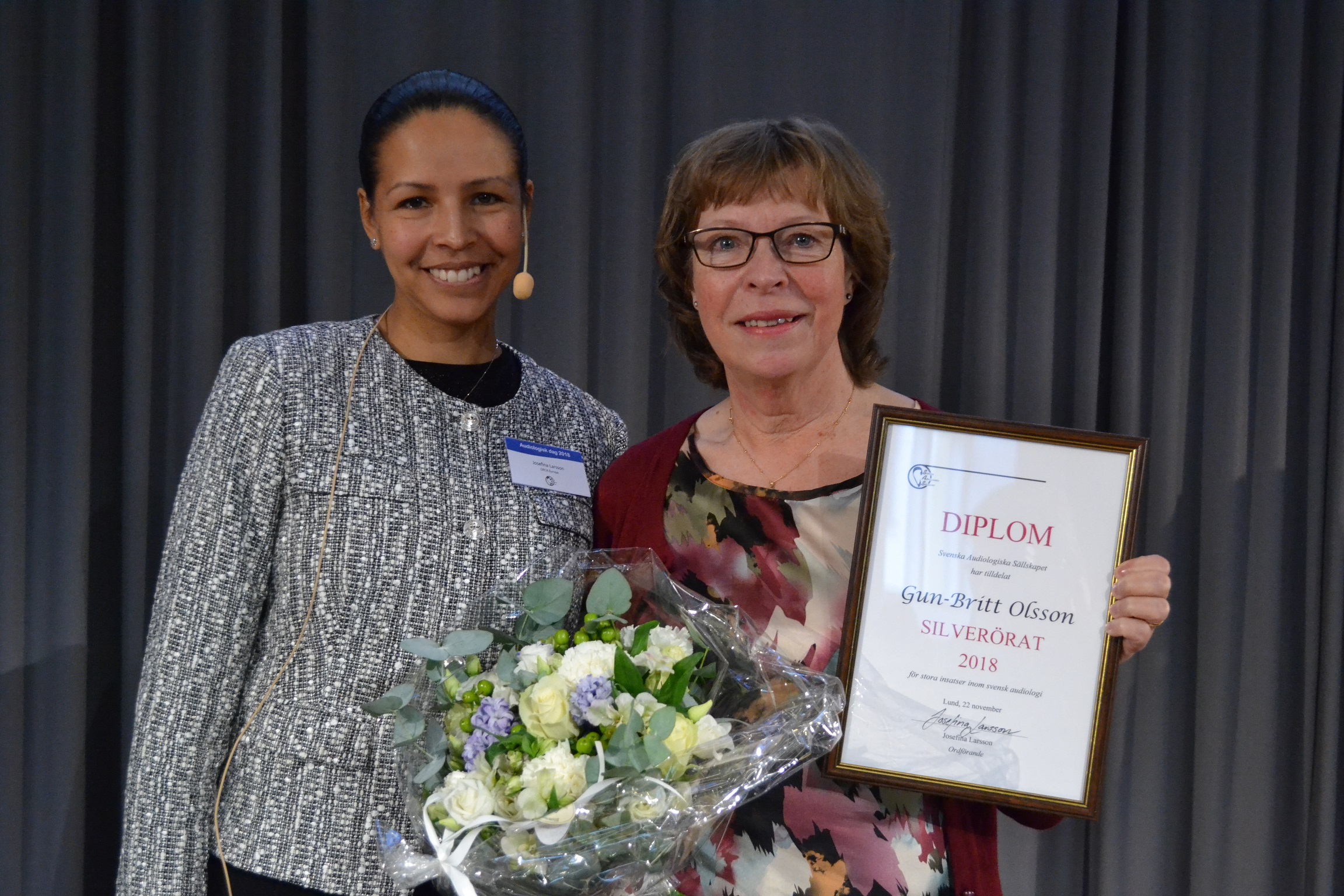 Priset delades ut av Svenska Audiologiska Sällskapets ordförande, Josefina Larsson, vid Audiologisk dag, en årligen återkommande konferens inom audiologi, som i år ägde rum i Lund den 22 november.